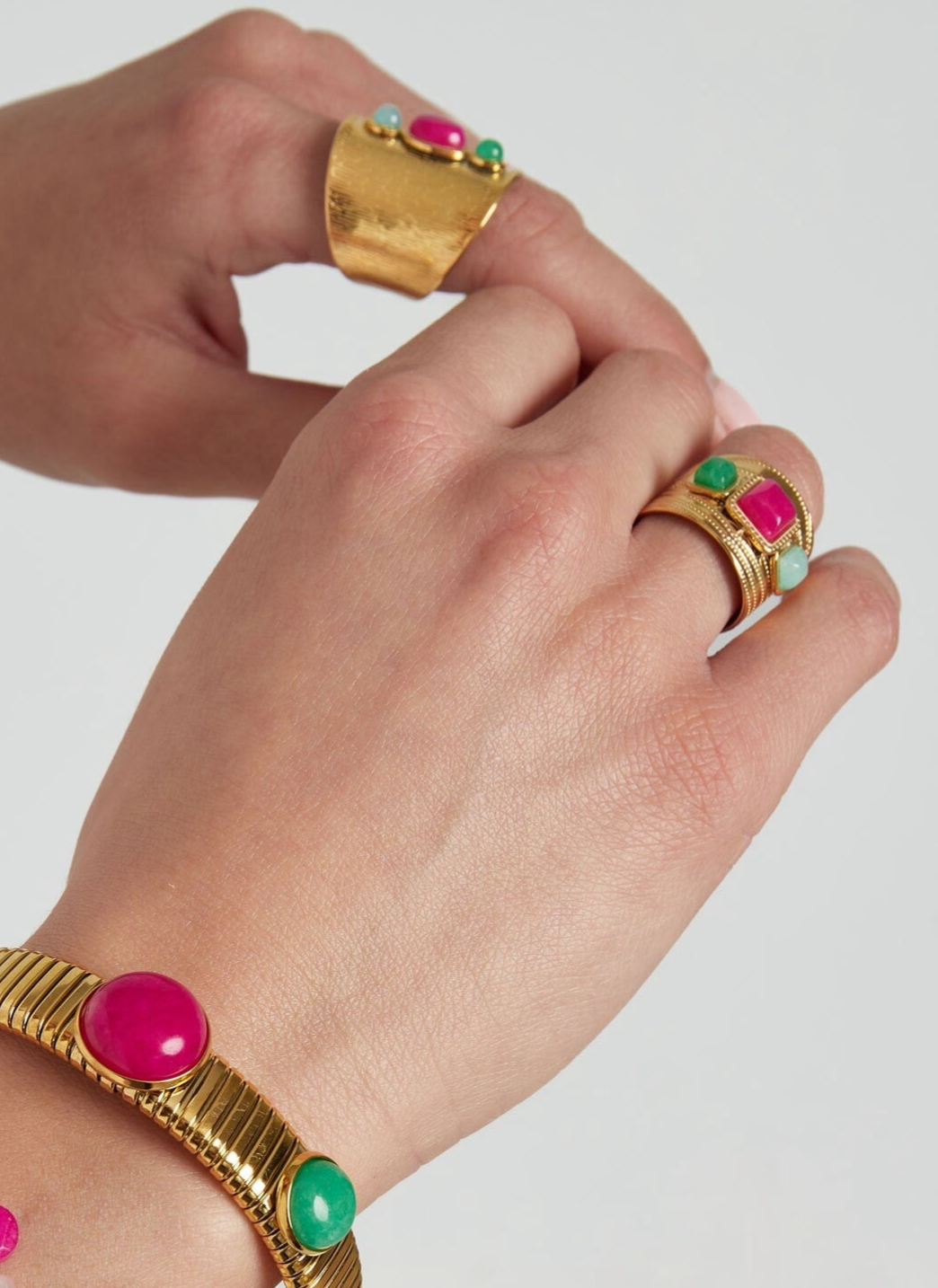 Deze ring is allesbehalve basic. Met z’n gouden finish en drie opvallende stenen in roze, turquoise en groen is dit het perfecte statement piece voor wie van kleur houdt. Draag ‘m solo of combineer met andere ringen voor een boho-chique vibe.