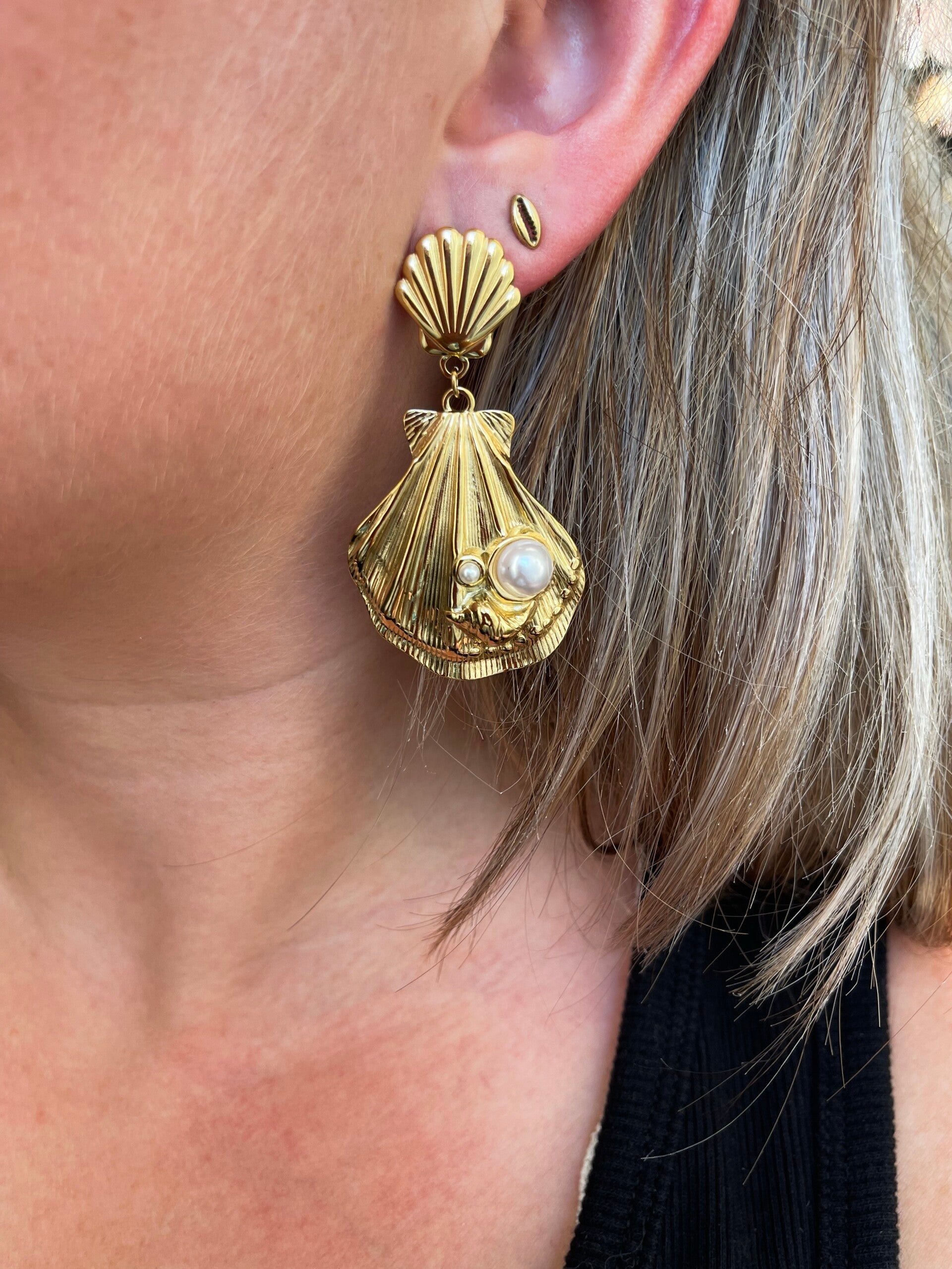 Zomer in je oren! Deze betoverende schelpoorbellen brengen je meteen in een beachy boho mood. Het goudkleurige ontwerp met fijne details en parelaccenten doet denken aan een verborgen schat uit de zee. Perfect voor de zonnige dagen, strandfeestjes of gewoon als je het vakantiegevoel even wilt vasthouden.