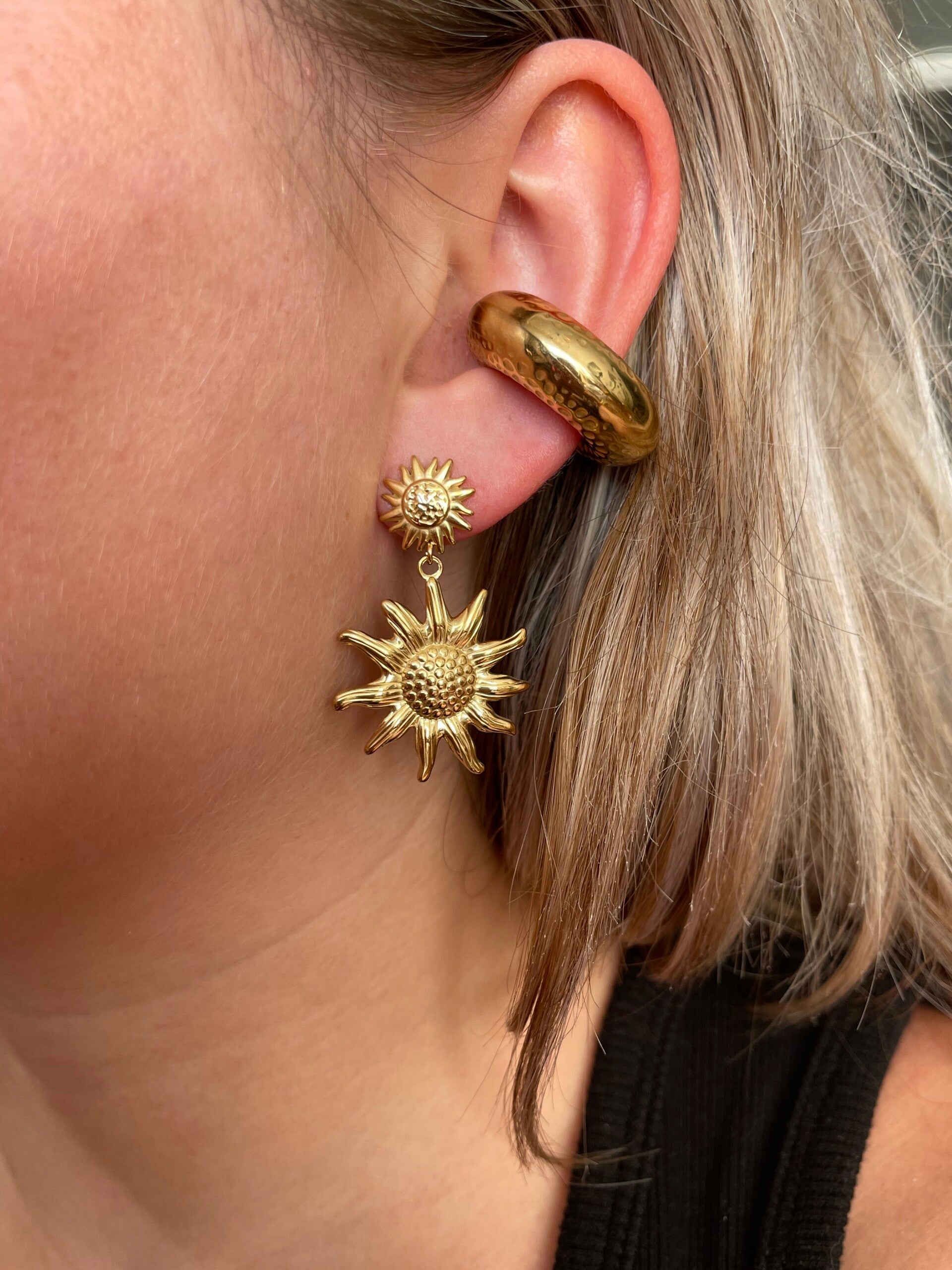 Laat je stralen met deze zonnige oorbellen – de perfecte accessoire voor wie elke dag een beetje zonneschijn wil meedragen. Met de gedetailleerde zonnestralen en goudkleurige afwerking brengen deze oorbellen direct warmte, licht en positieve vibes.