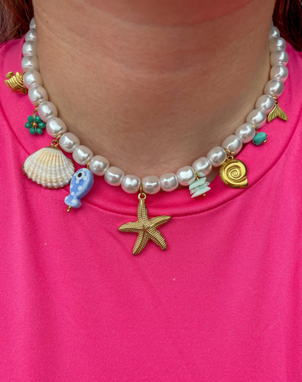 Deze zomerse parelketting is jouw ultieme accessoire voor zonnige dagen en zoute haren. De blue beach ketting is afgewerkt met een speelse mix van zeegeïnspireerde bedels – van een gouden zeester tot een keramieken visje, schelp en turquoise bloemetjes. Elk detail ademt strand, statement en boho.