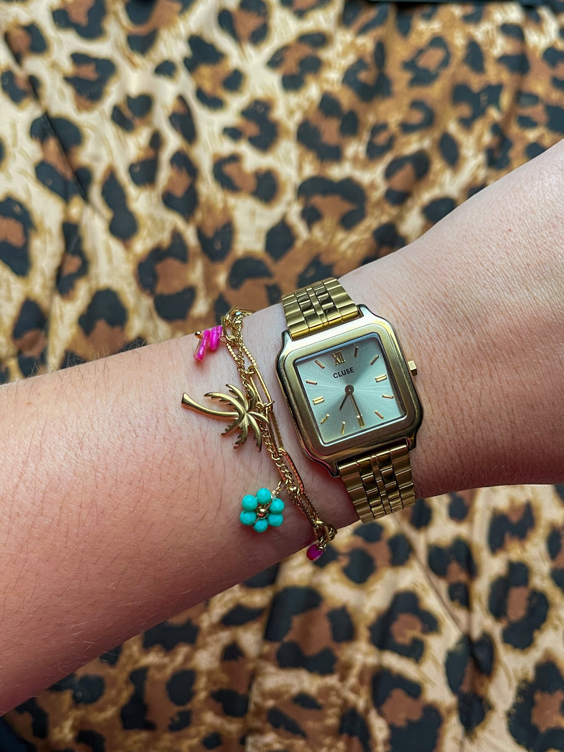 Deze vrolijke bedelarmband brengt instant summer vibes naar je pols. Met een mix van kleurrijke kralen en speelse bedels – waaronder een gouden palmboom – is dit het perfecte accessoire voor wie houdt van kleur, zon en een beetje boho flair.