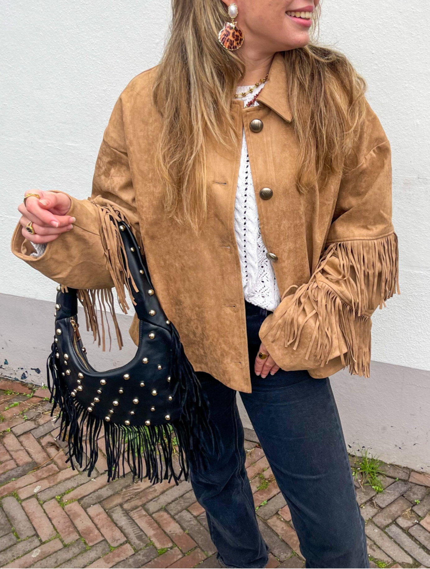 Onze zwarte franje stud schoudertas combineert boho vibes met een stoere twist. De lange franjes zorgen voor beweging en een speels effect, terwijl de gouden studs het geheel een edgy uitstraling geven. Perfect voor een casual dagje uit, een festival of om je dagelijkse outfit net dat beetje extra te geven. Ruim genoeg voor al je essentials en comfortabel om te dragen – jouw nieuwe go-to tas!🖤