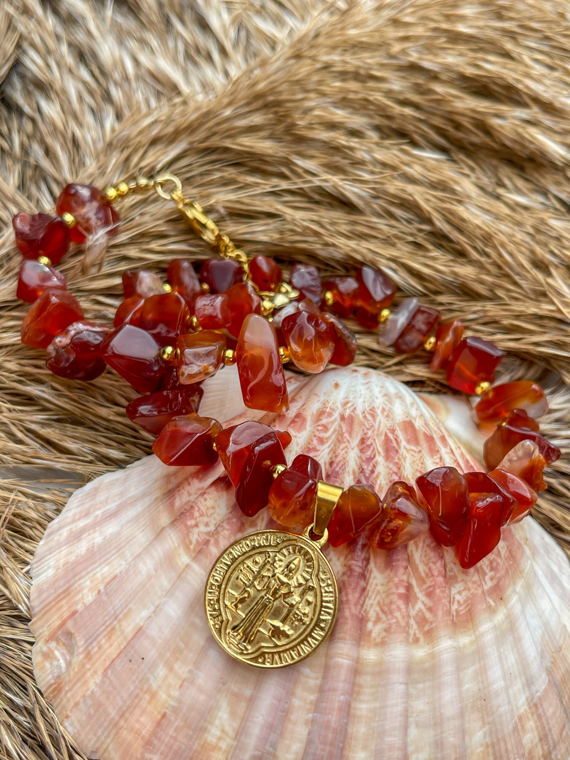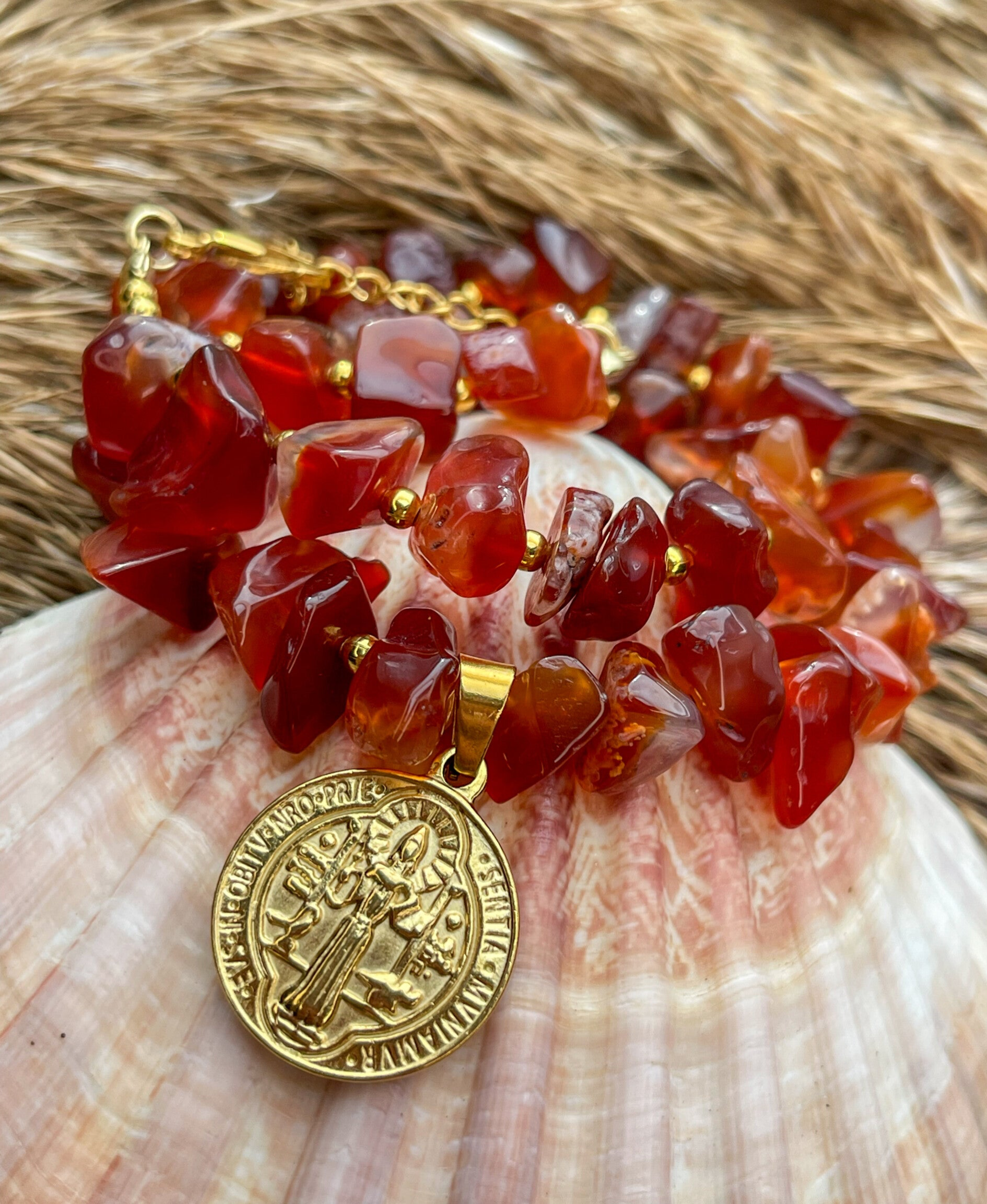 Deze elegante ketting straalt warmte en kracht uit door de combinatie van diep roodbruine agaat natuursteen en een goudkleurig medaillon. Agaat staat bekend om zijn aardende en beschermende werking, en geeft iedere outfit een natuurlijke, stijlvolle touch. De grove steentjes zorgen voor een speelse, bohemian uitstraling, terwijl het medaillon een luxe en spirituele vibe toevoegt.
